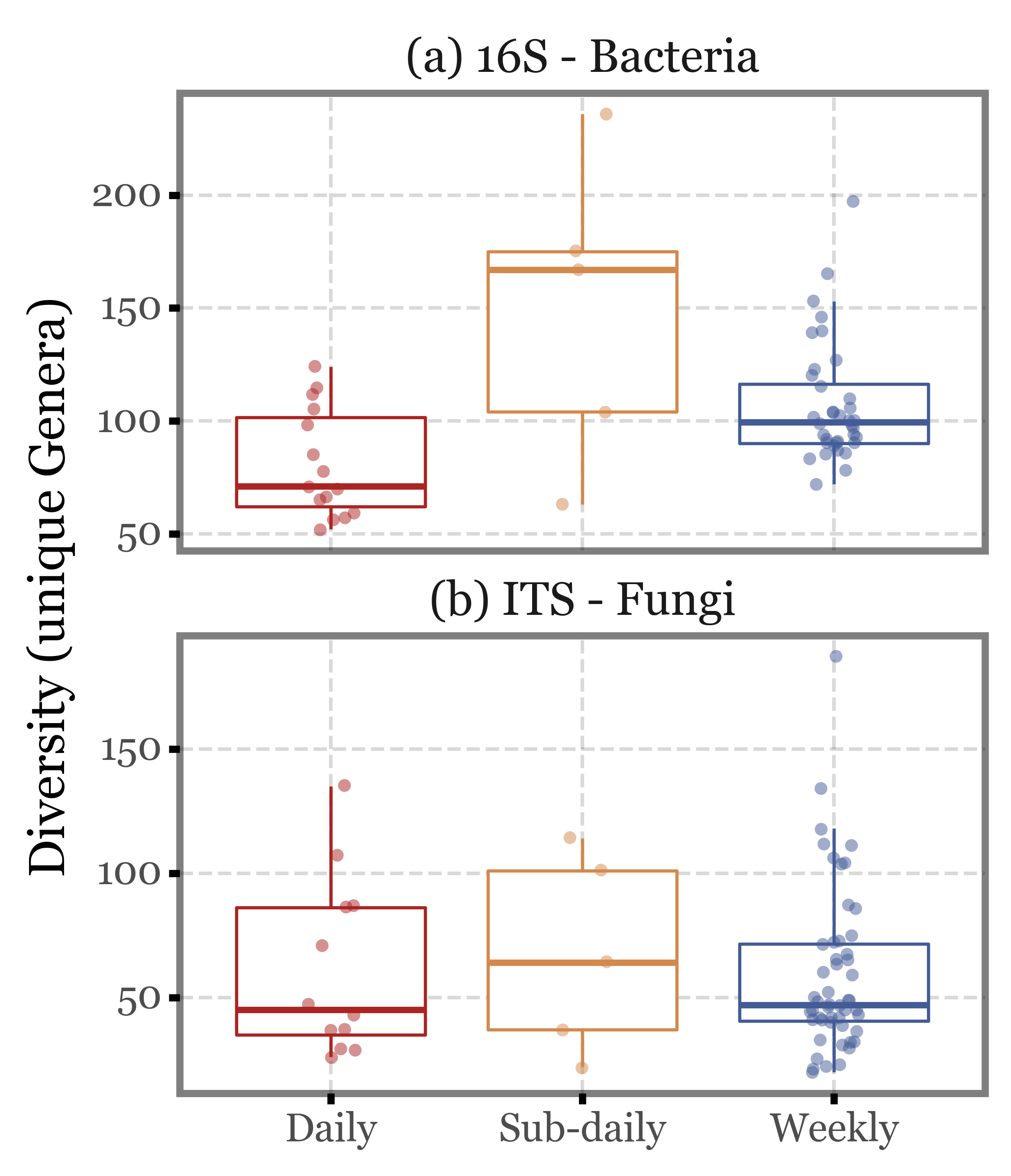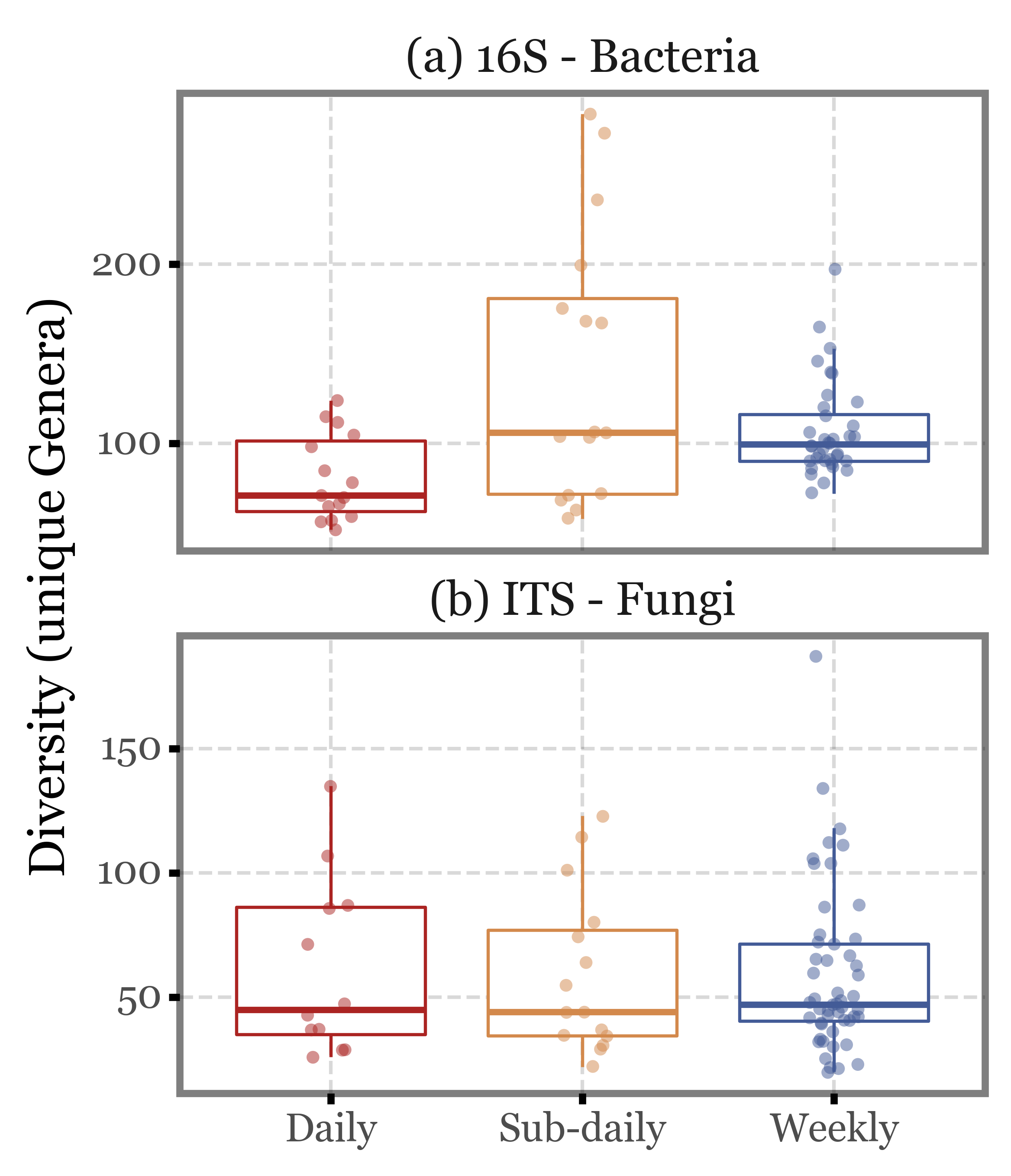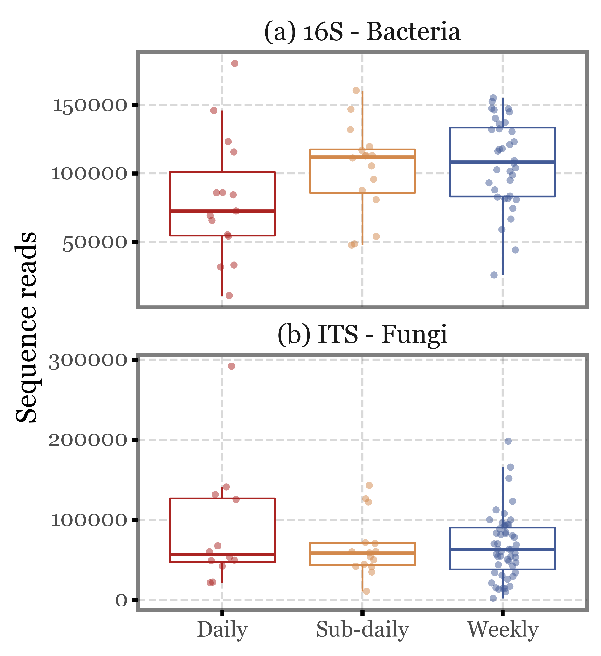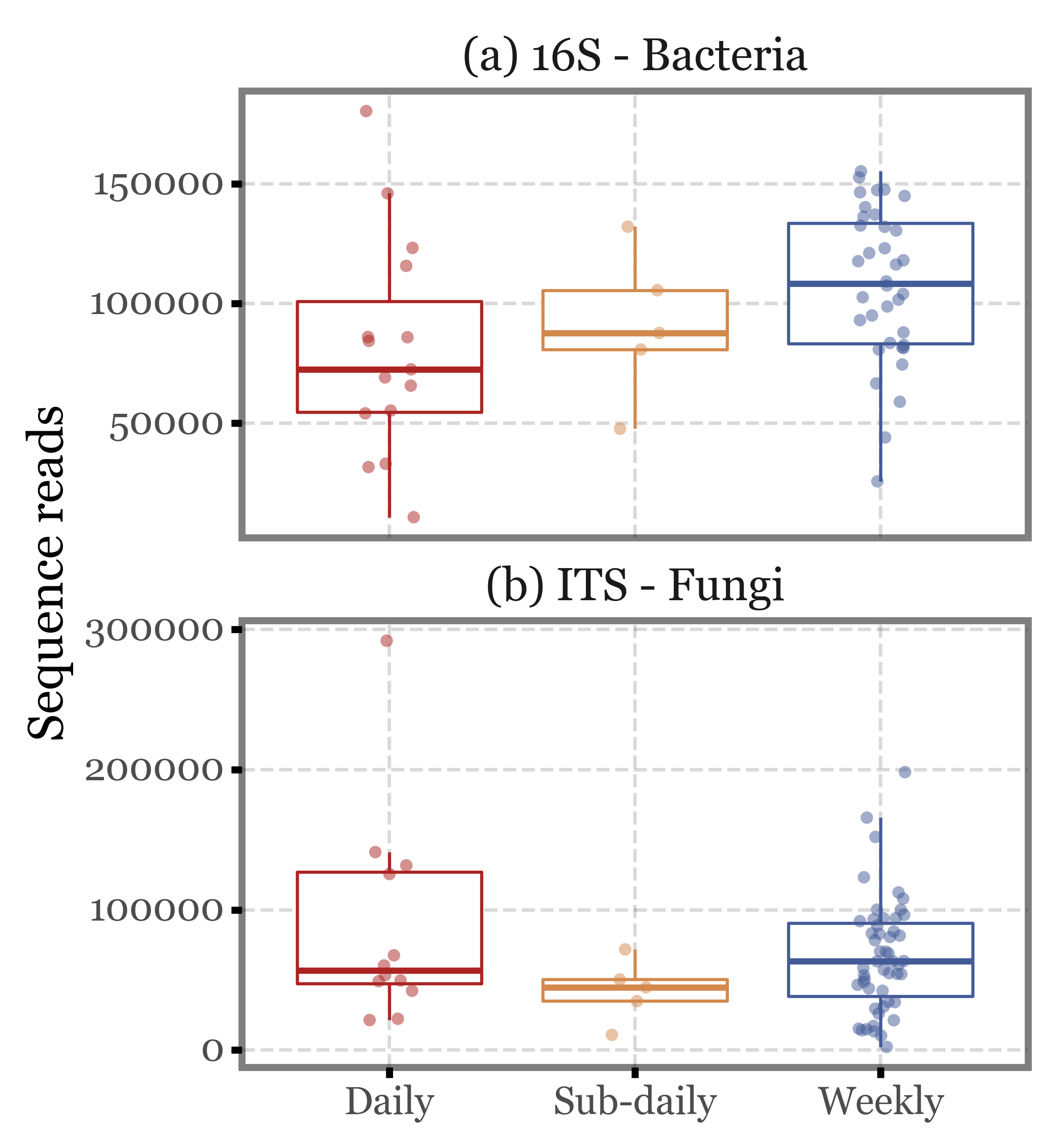Again, the median values are quite similar across the different sample types both for ITS and 16S, and the interquartile ranges overlap in all cases. There are some outliers in the subdaily samples group, but they are not enough to change the overall picture.