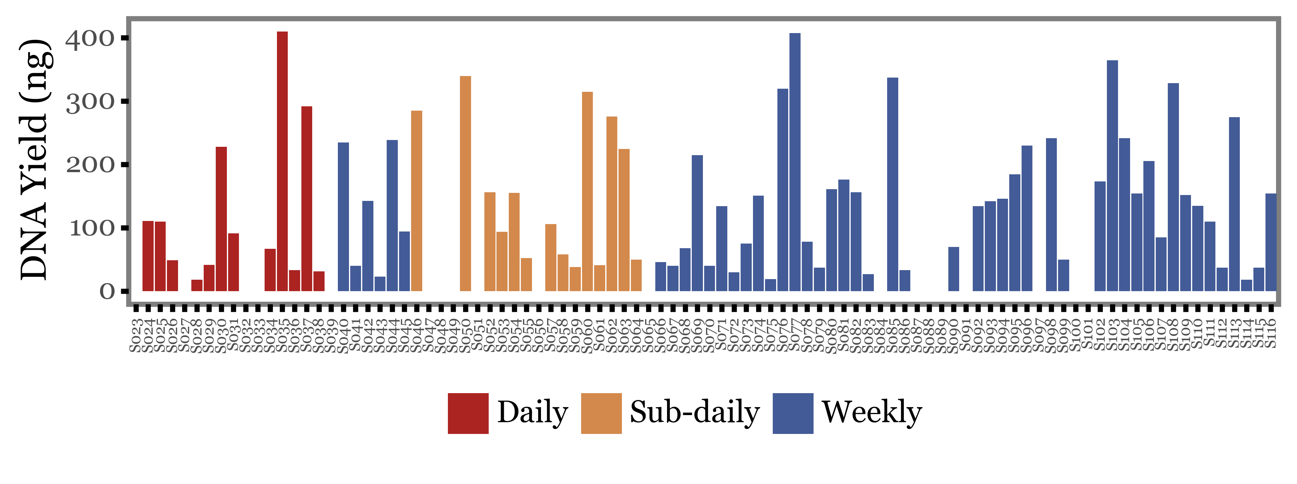Let’s take a look at the DNA yield (in ng recovered) for each sample on a sample by sample basis: