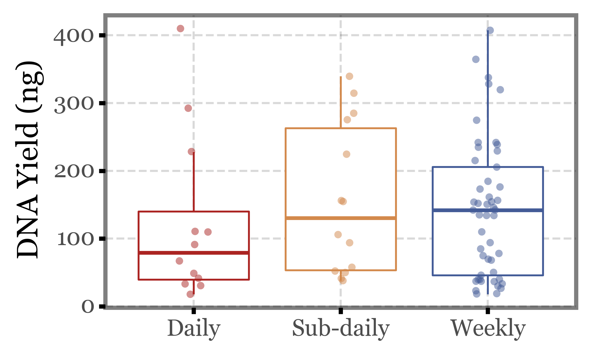 Again, huge variability, even more than in the previous metrics we evaluated. There are samples under 50 ng and over 300 ng in all three groups of samples.