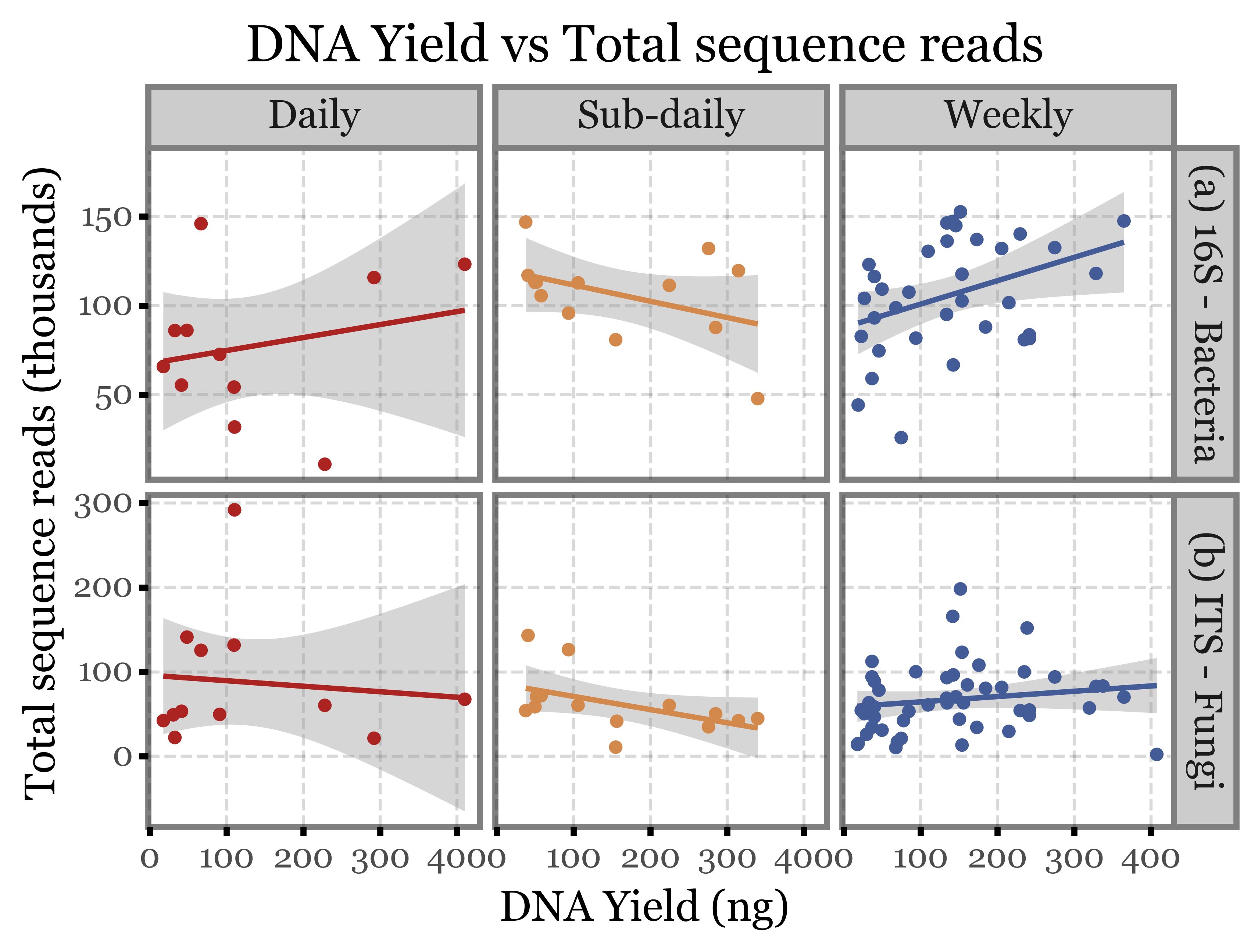 + p9.labs(x='DNA Yield (ng)', y='Total sequence reads (thousands)',