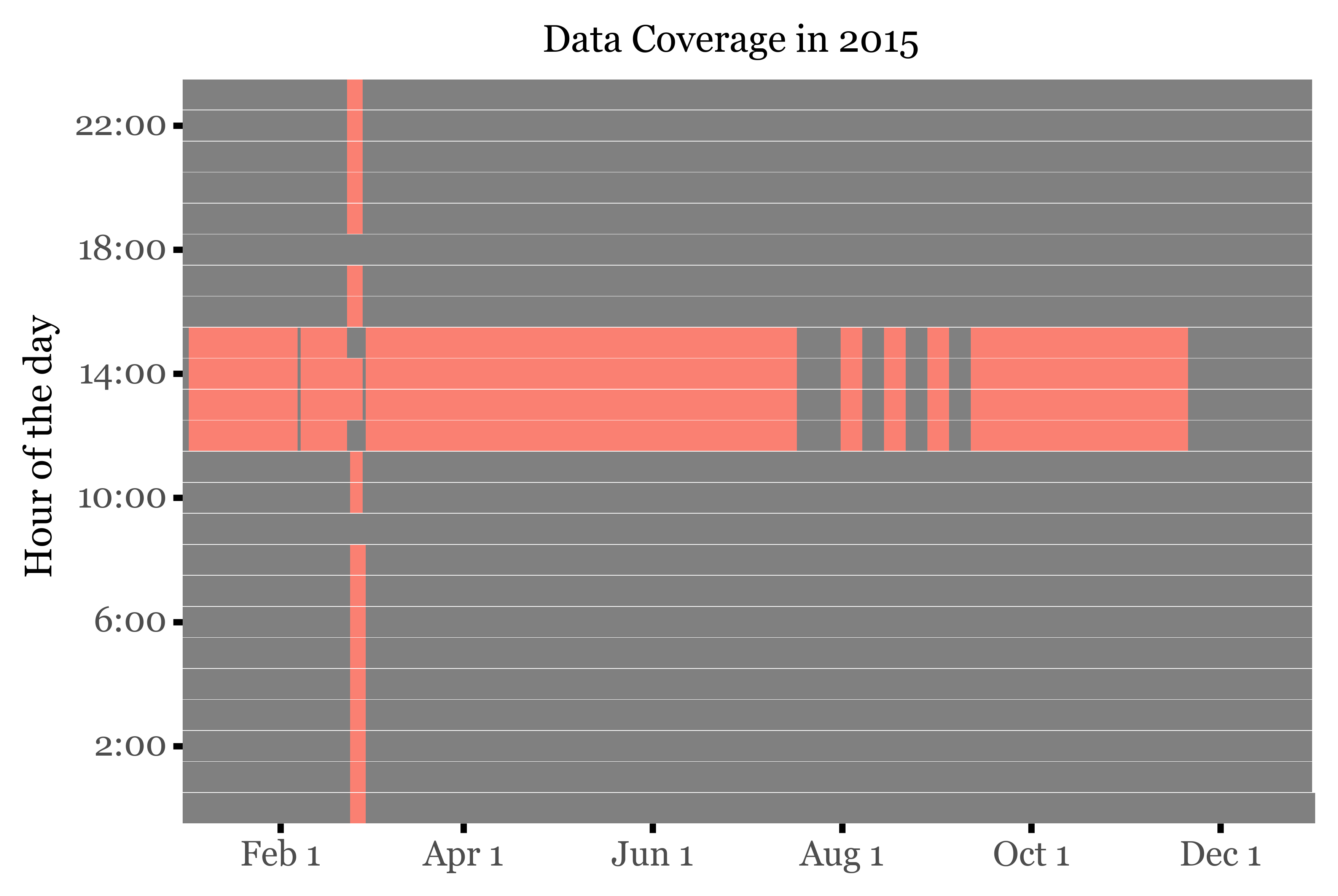 However, during February 2015, an intensive campaign was carried out, where the sampling was performed at a subdaily frequency by Sílvia and Roger. If we take a look at the hourly coverage of samples of the year 2015, this becomes evident: