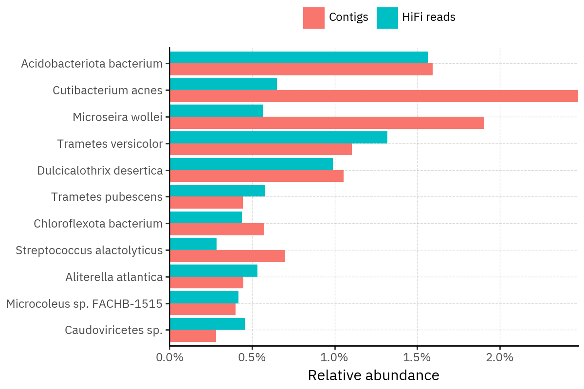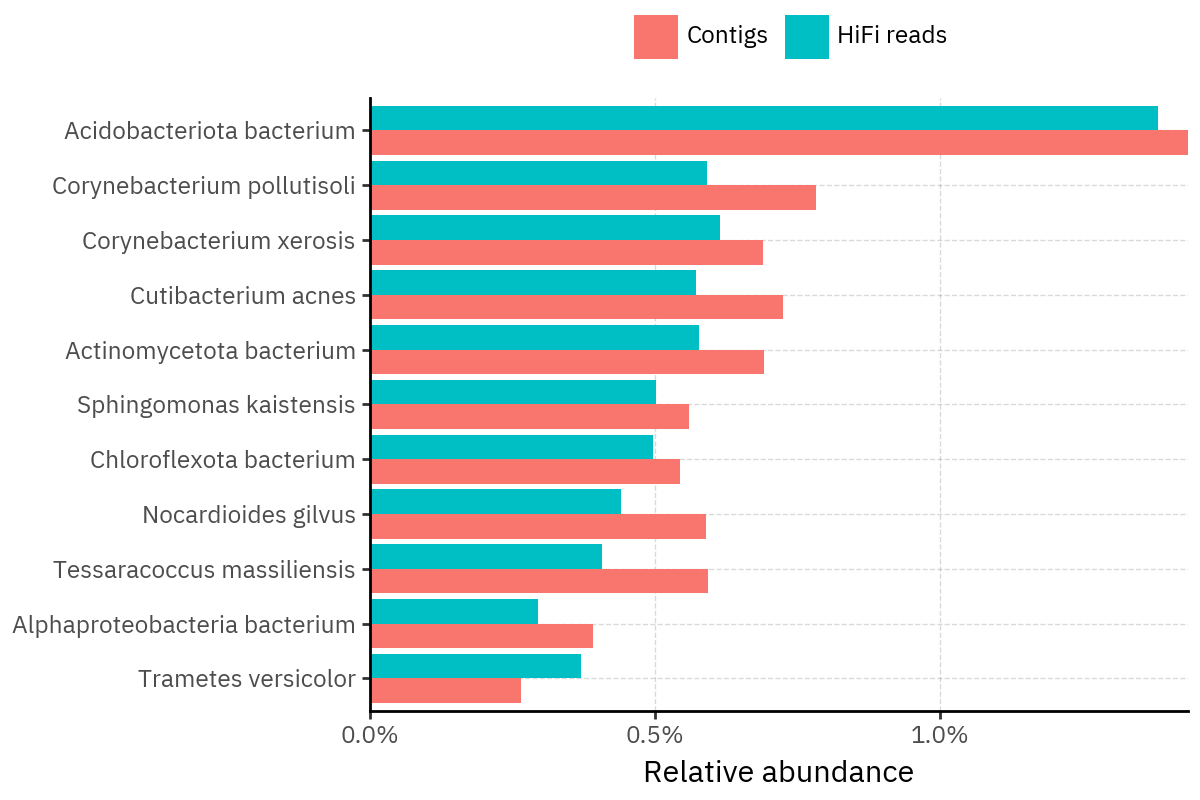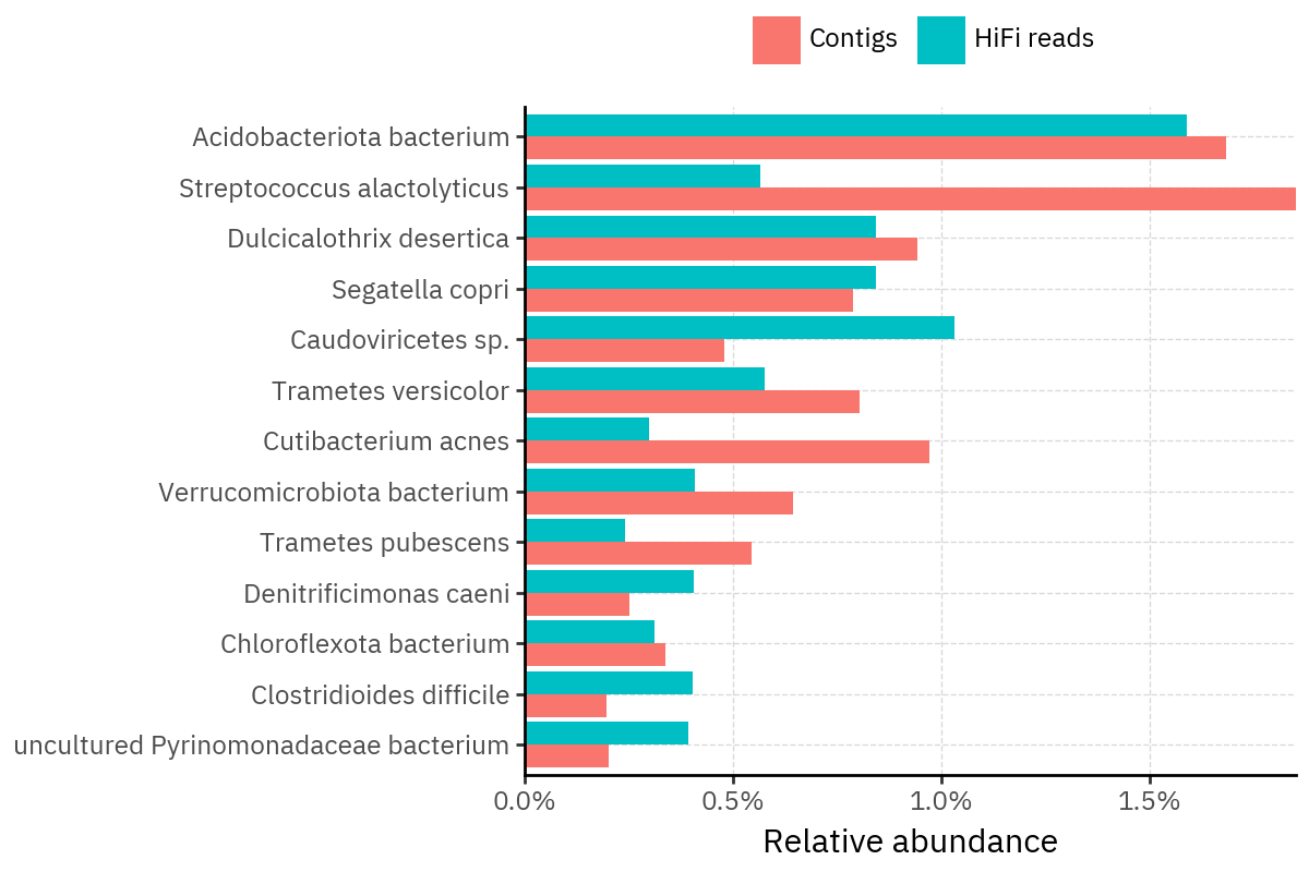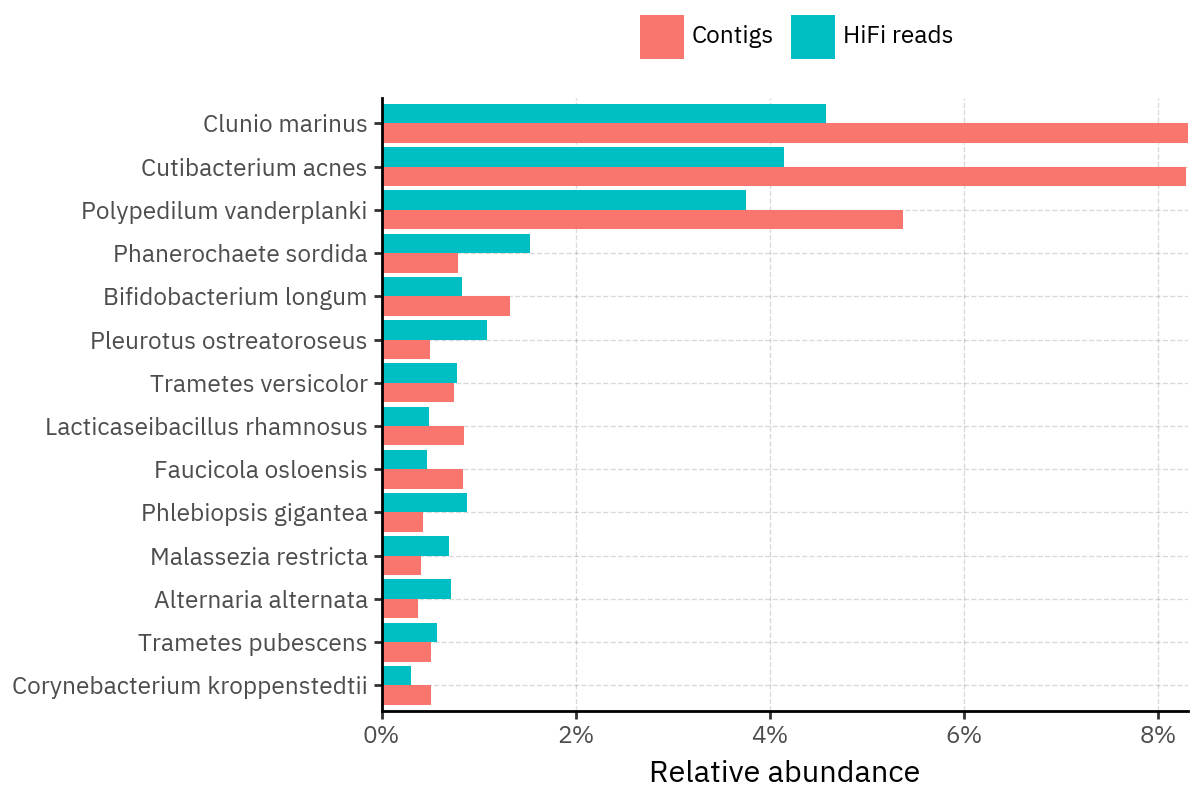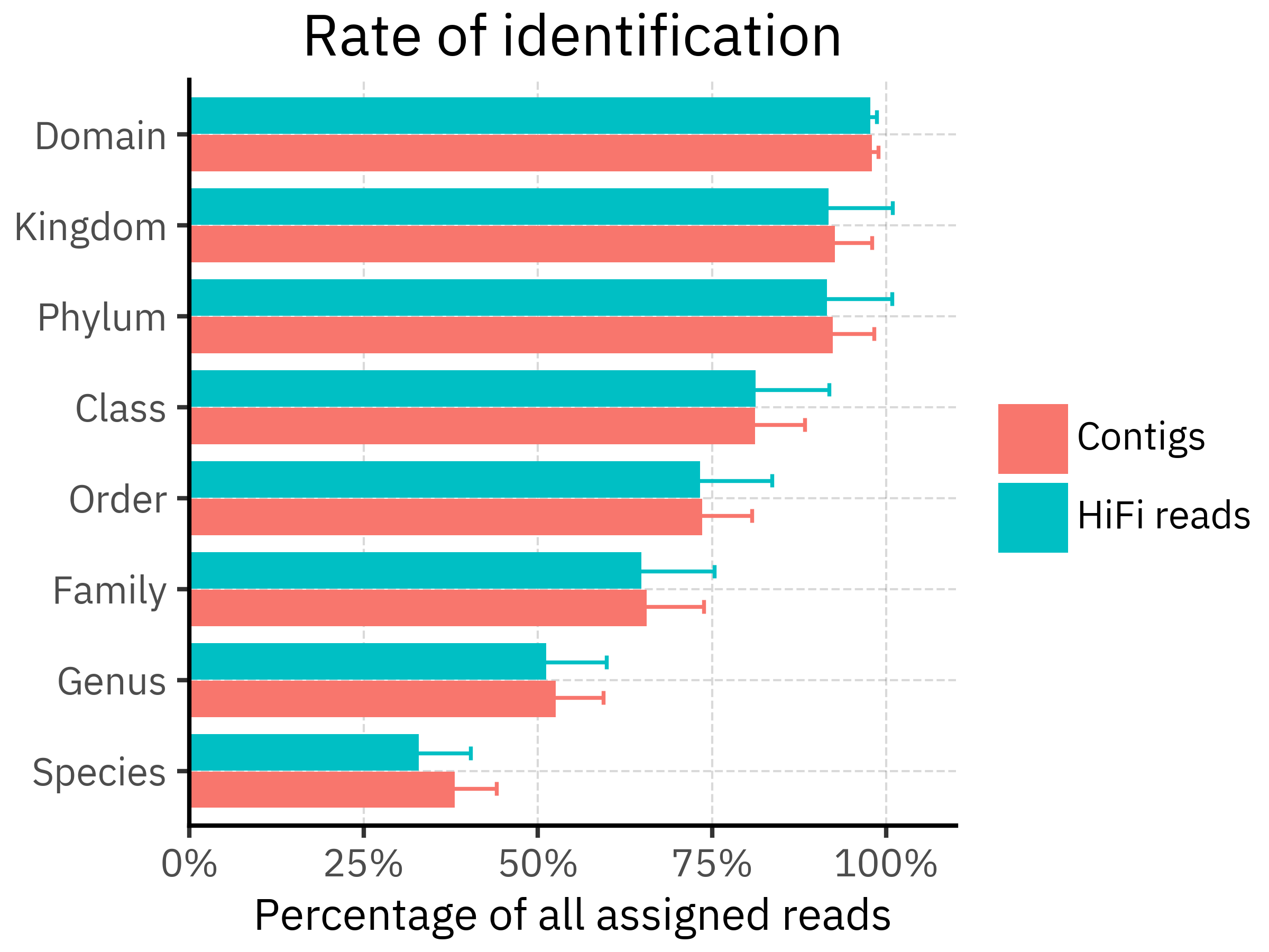 %load_ext rpy2.ipythonAssembled contigs vs long HiFi reads for taxonomic classification