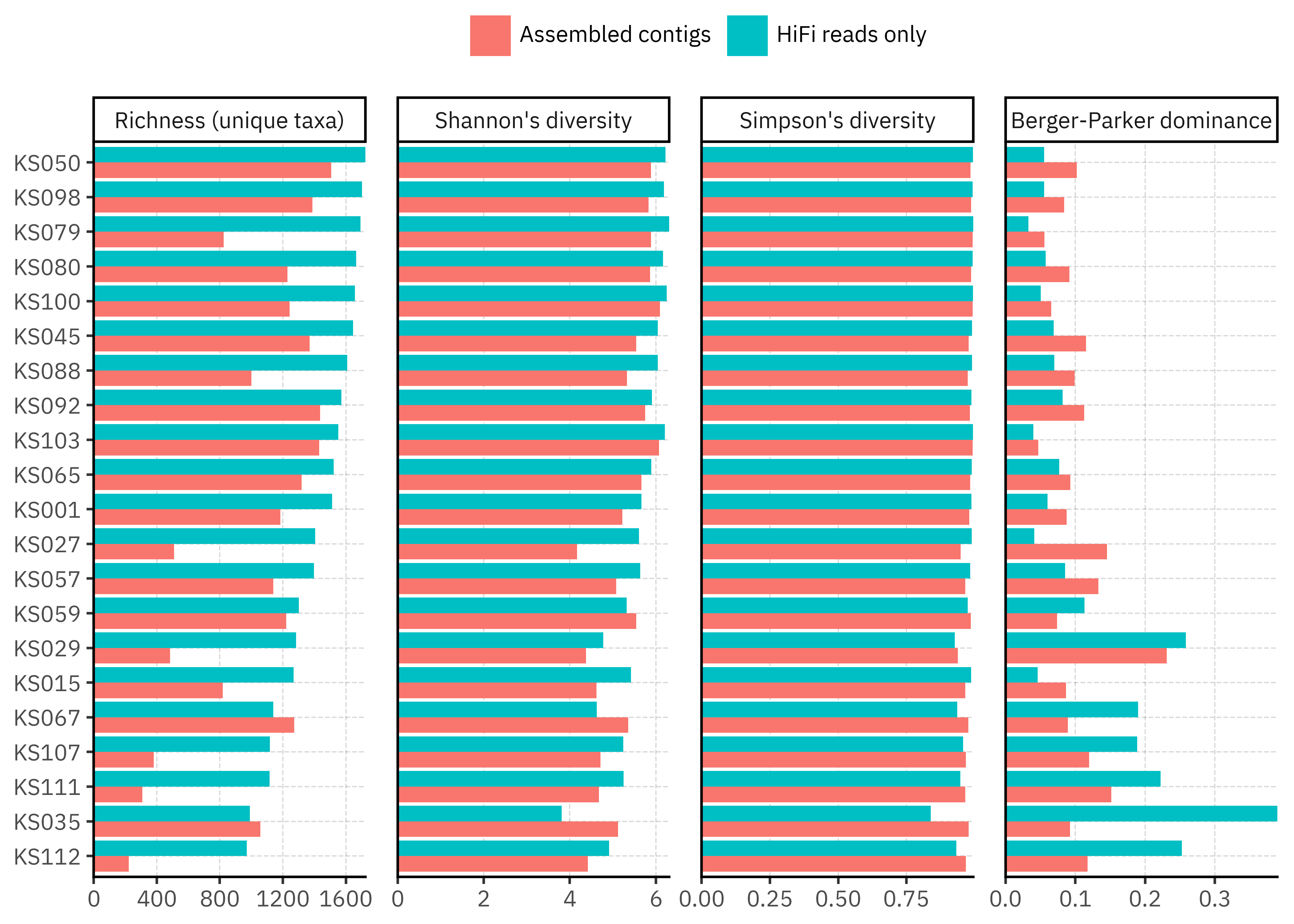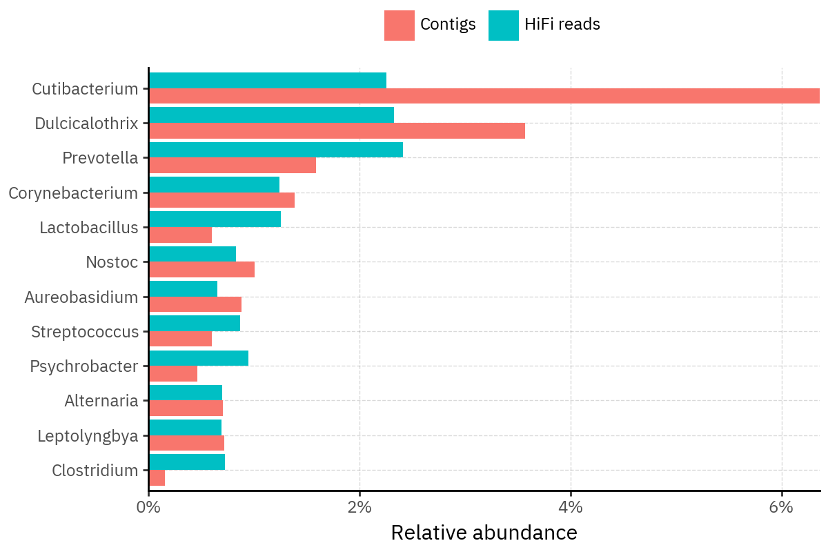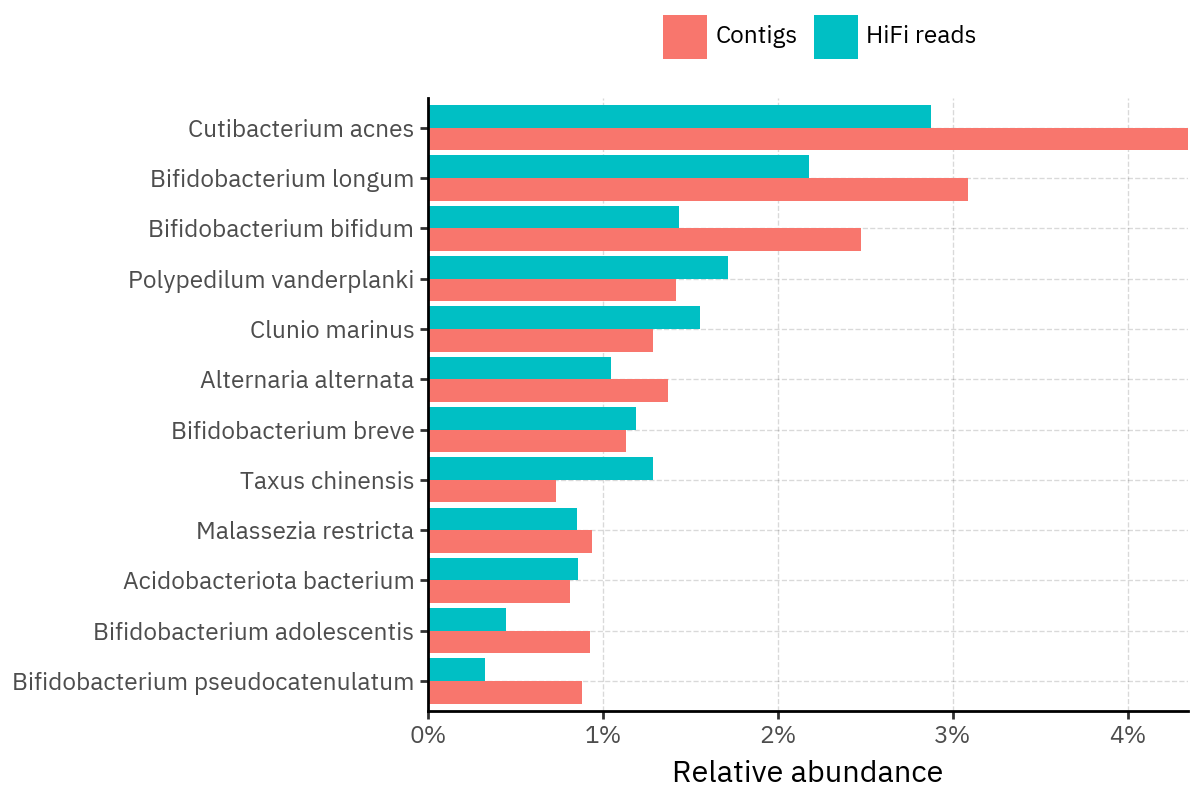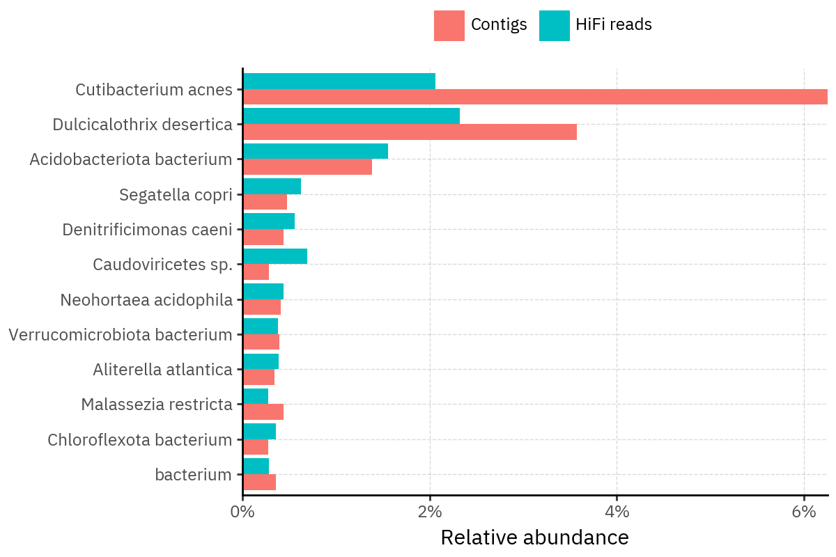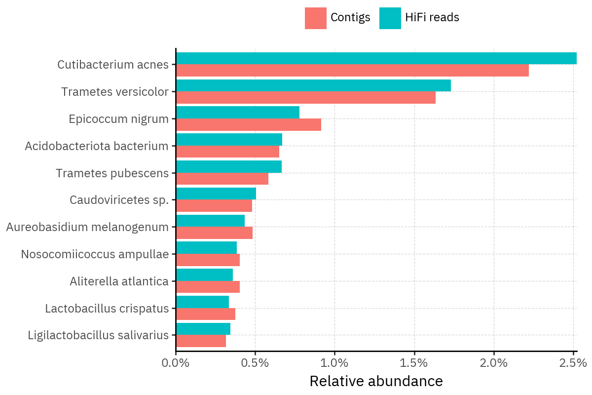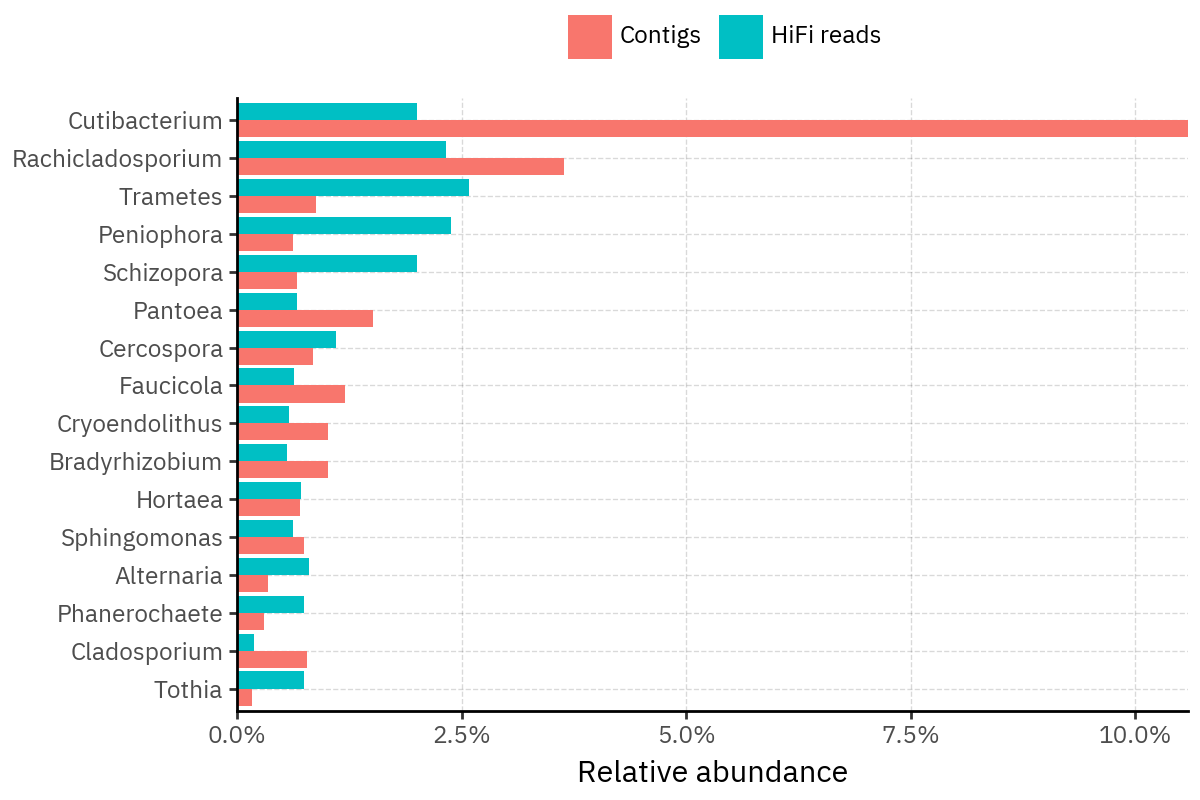 %load_ext rpy2.ipythonAssembled contigs vs long HiFi reads for taxonomic classification
