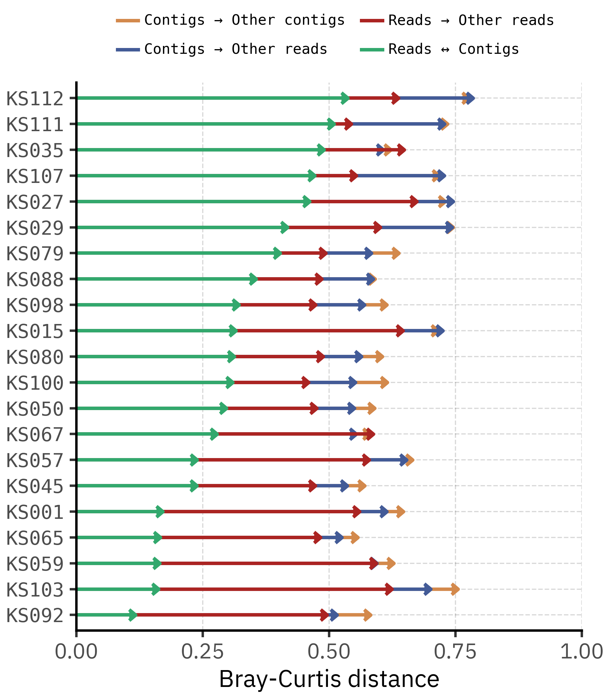 Across samples, the “headline” taxa are often shared, but their estimated relative abundances can shift between reads and contigs. For example, in KS001 and KS045, Cutibacterium acnes is detected in both pipelines but appears substantially higher in contigs, while several other taxa show smaller method-specific shifts.