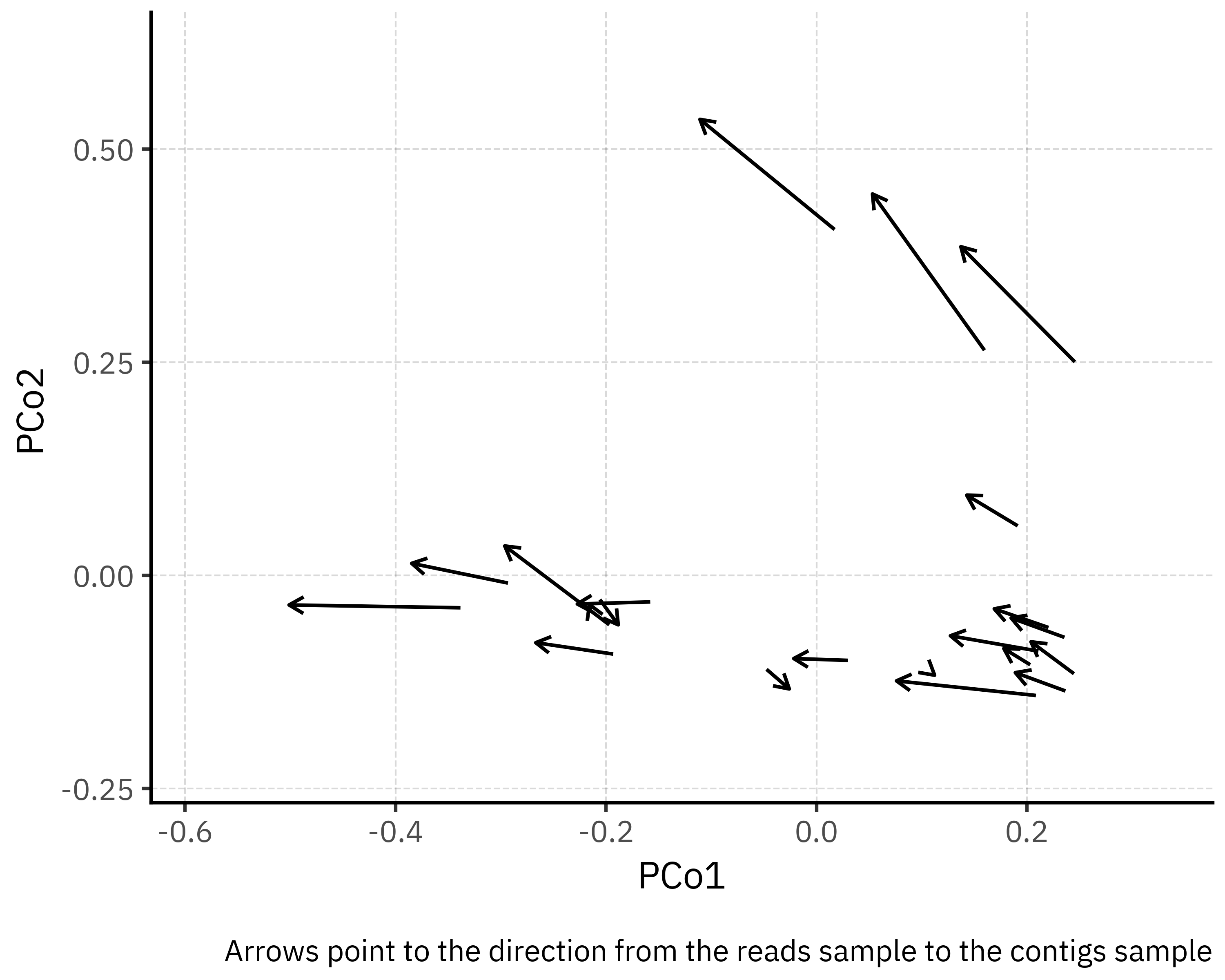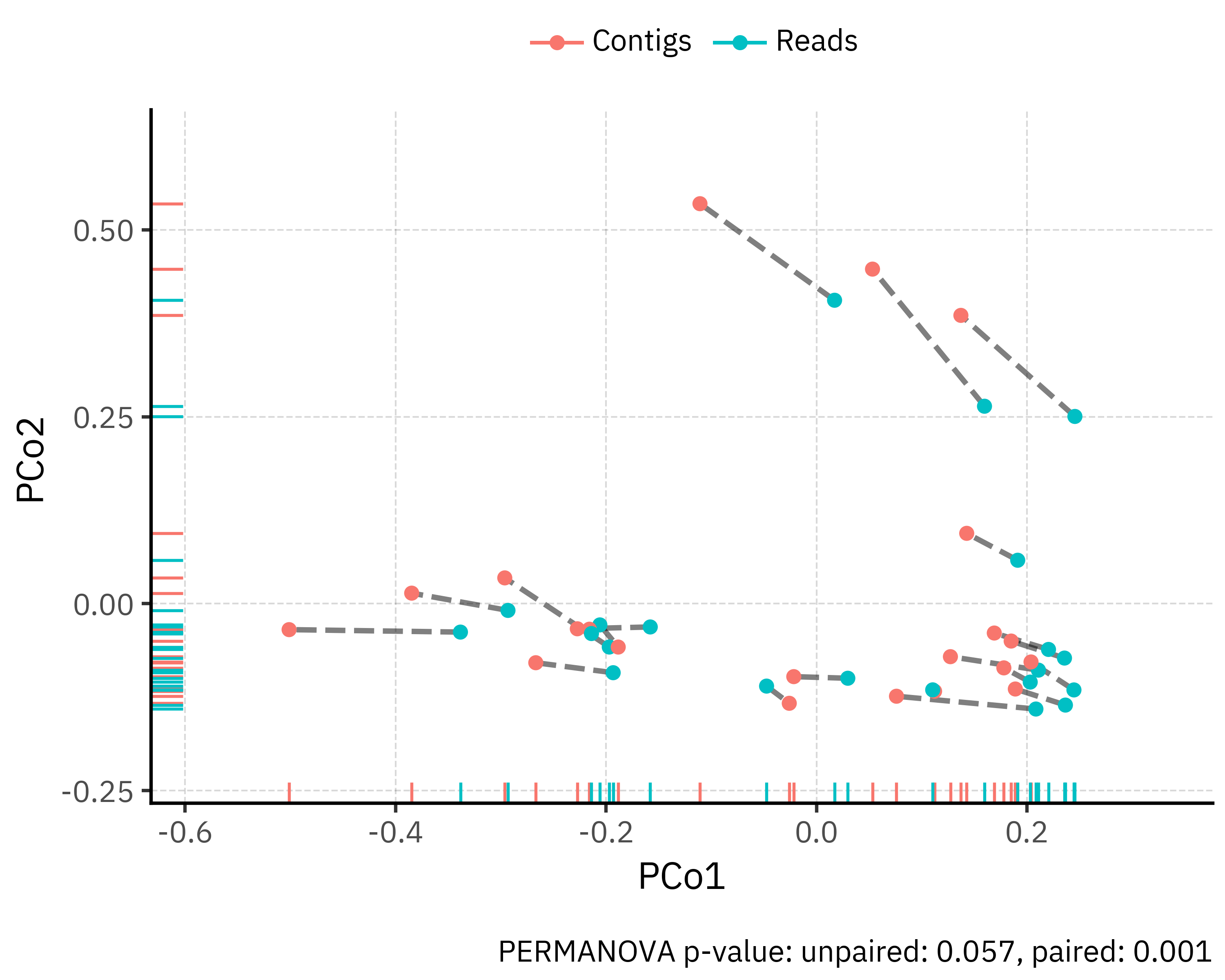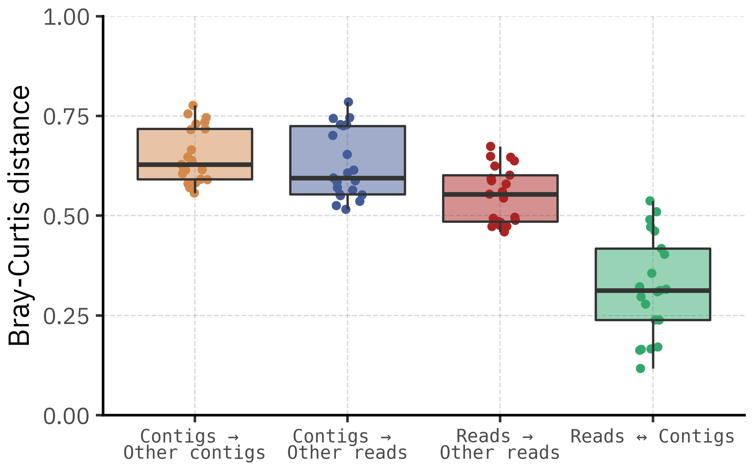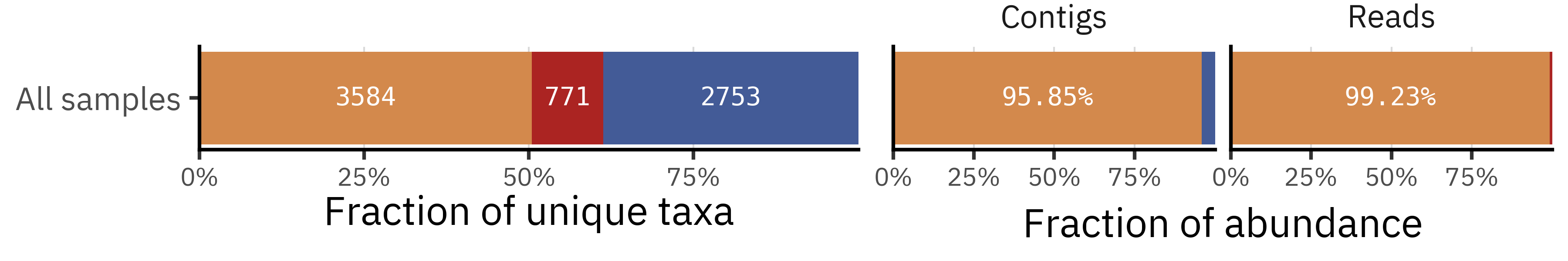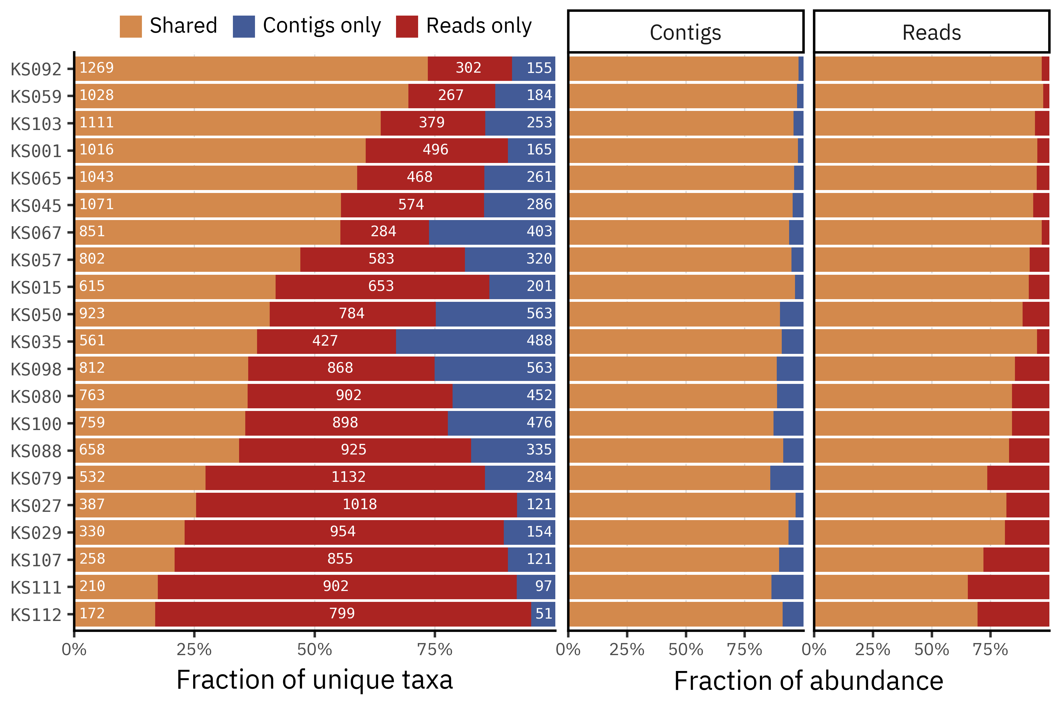 In our data, both pipelines assign almost all abundance at Domain/Kingdom/Phylum, but the assigned fraction drops steadily towards Genus and Species. Contigs are slightly higher at most ranks, but specially at the Genus and Species levels, consistent with contigs providing more specific placements for part of the community. The differences, however, are not really strong in either case.