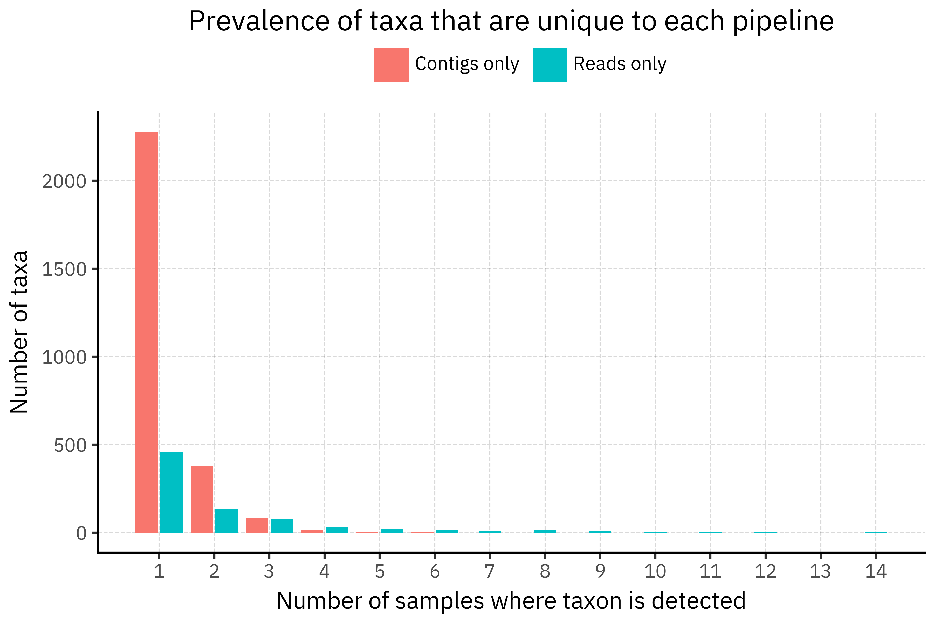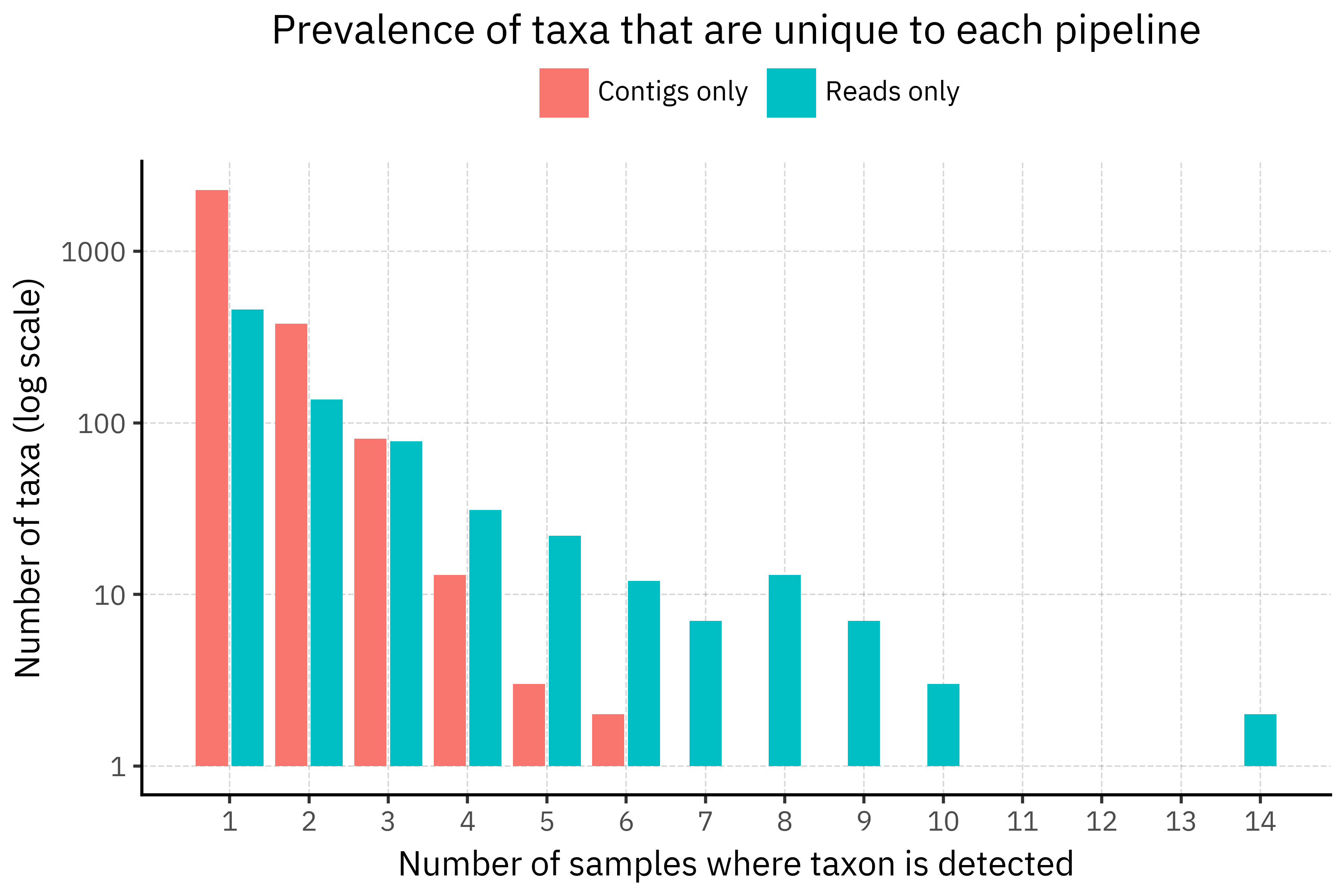 Overall, these panels suggest that many differences are not “new biology” appearing in one pipeline only, but a combination of (i) deeper vs shallower placement, and (ii) reweighting of the top taxa when collapsing evidence into contigs.