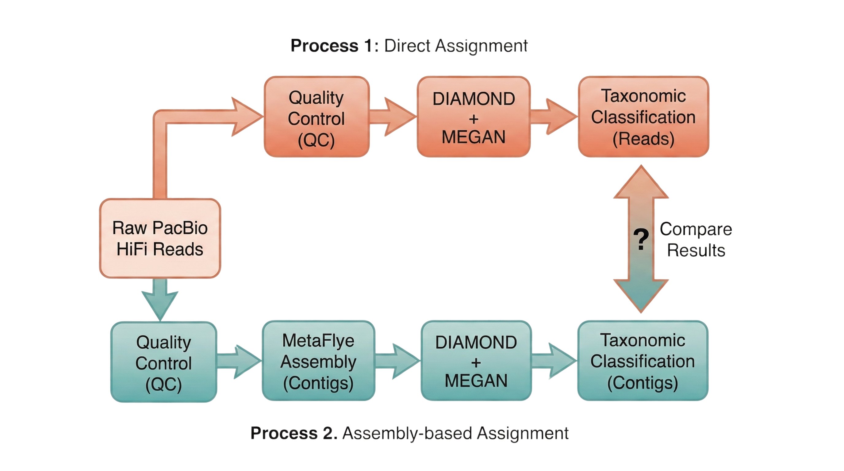 - Directly assigned using DIAMOND + MEGAN using the raw PacBio reads.