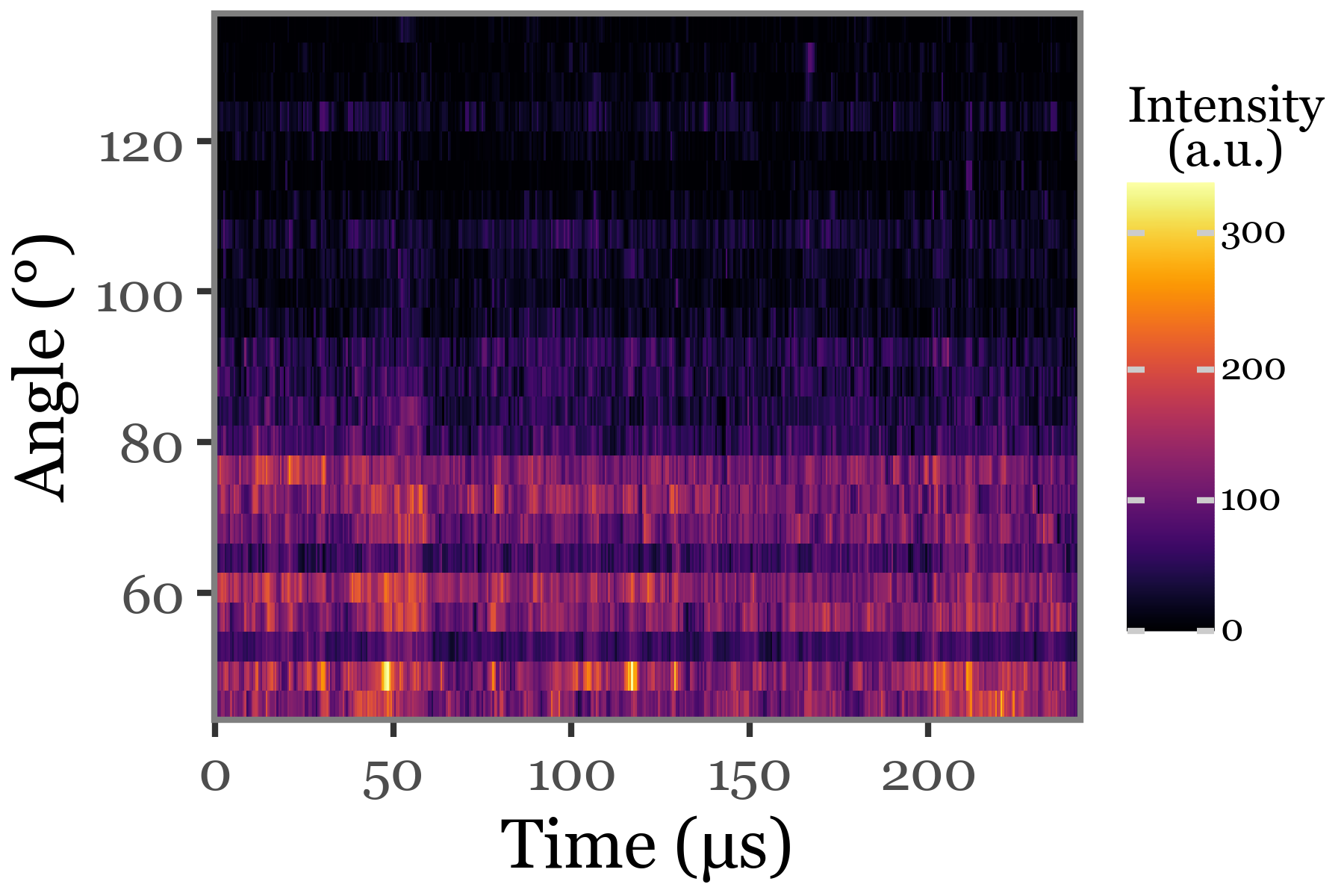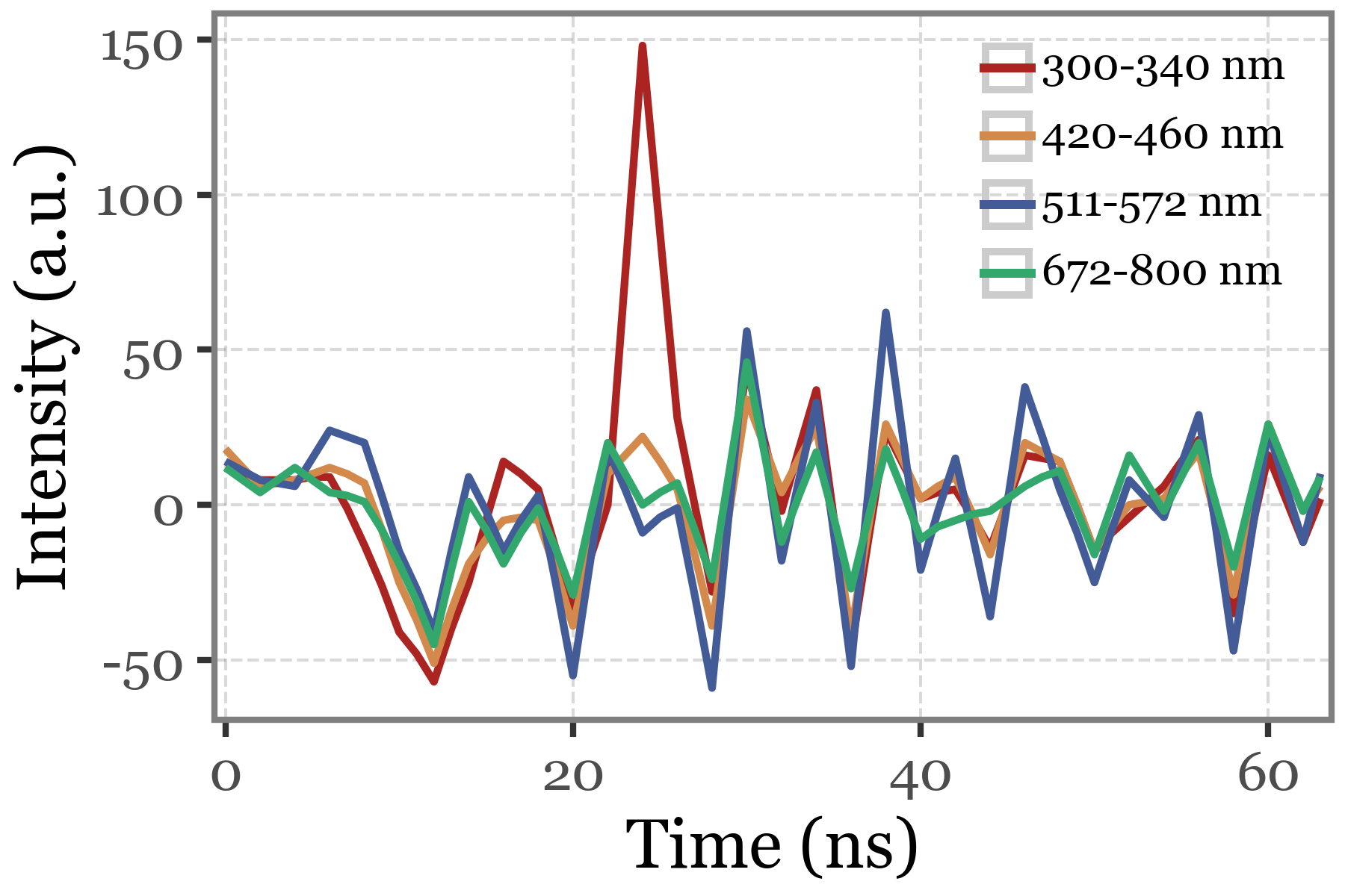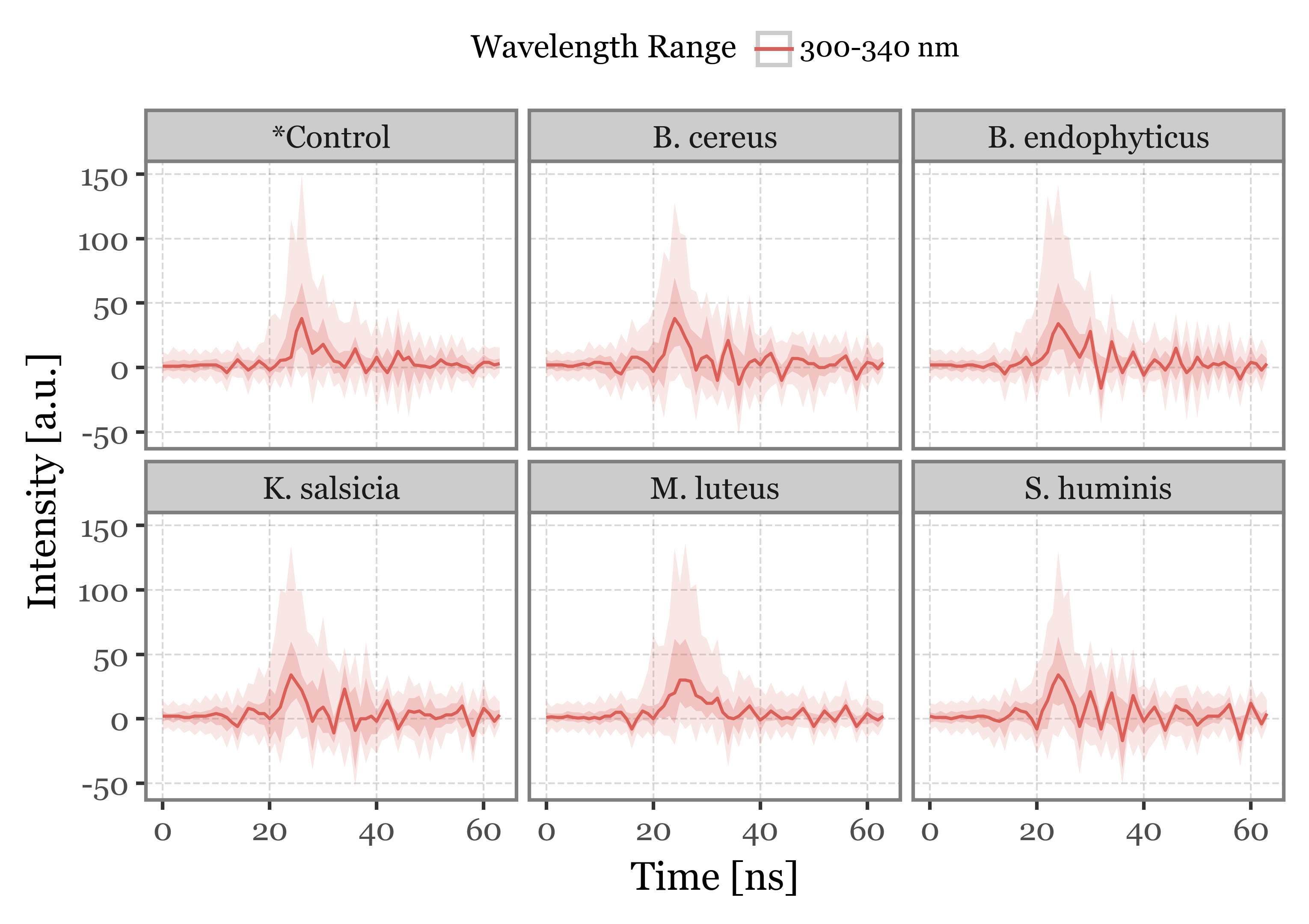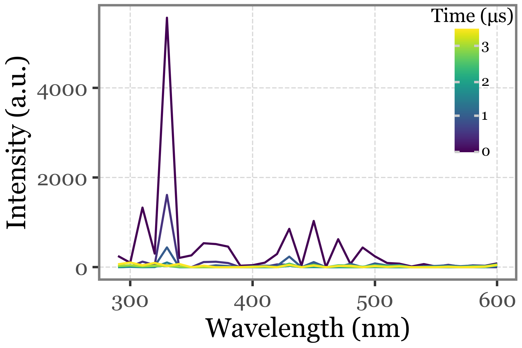 + p9.labs(x='Wavelength (nm)', y='Intensity (a.u.)', color='Time (µs)')