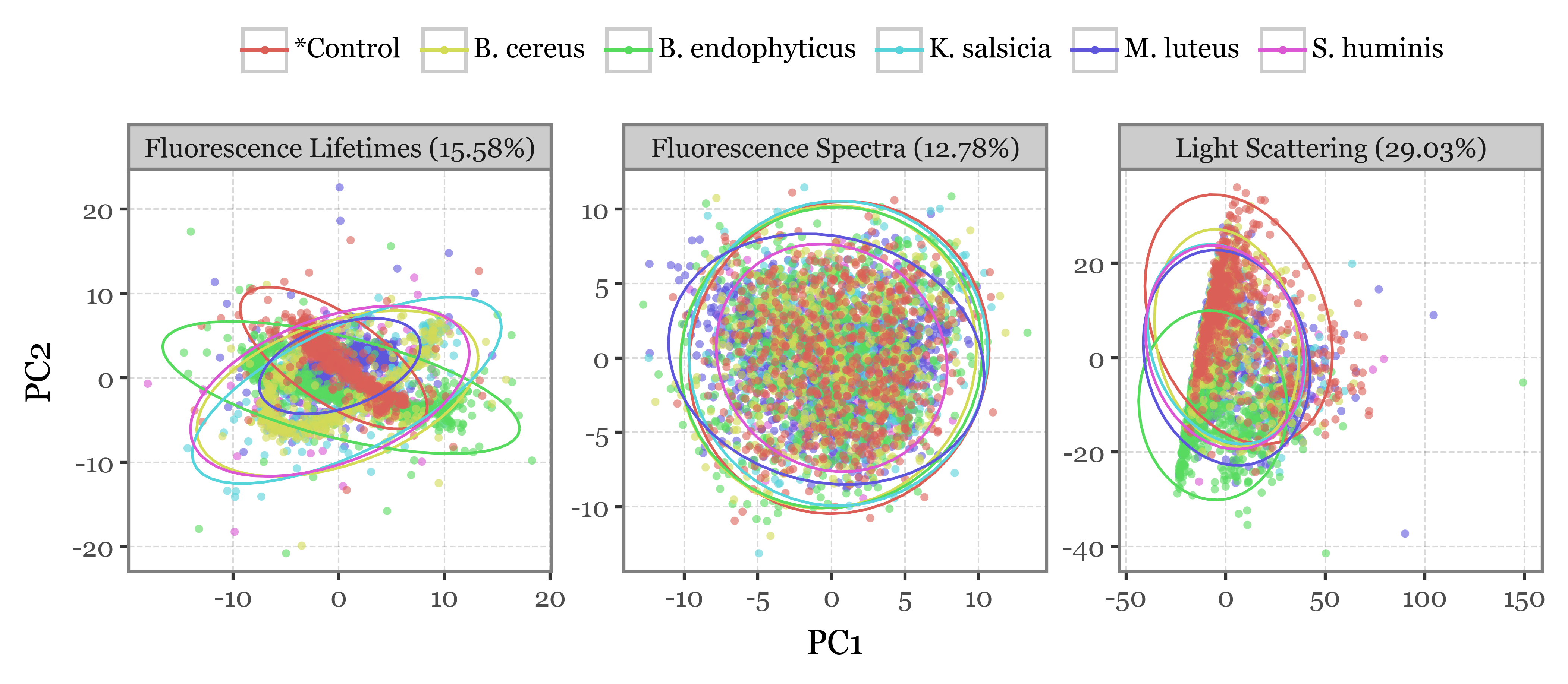 For figure 1, we generate some example plots of the fluorescence spectra, lifetime and scattering image for a particle. These were made by selecting the highest intensity particle from S. huminis group and plotting each of the three features: